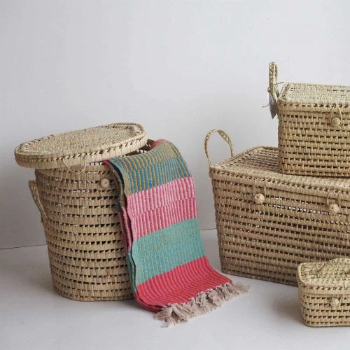 La corbeille ALIO est tressée à la main par nos artisans marocains à partir de feuilles de palmier. Sa forme cylindrique et son couvercle avec attache apportent une touche authentique et vintage à une décoration.