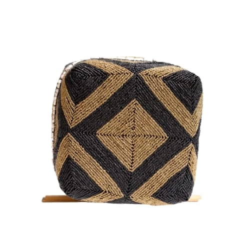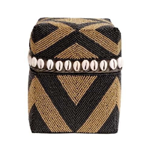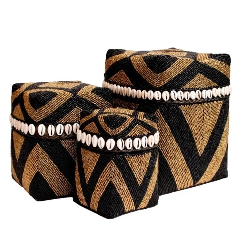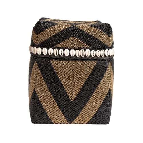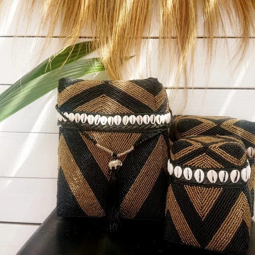 Matière : bambou tressé, perles de verres, coquillages cauris.