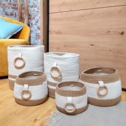 Meubletmoi Paniers Et Corbeilles Lot De 4 Paniers Rond En Corde De Coton Marron Et Blanc