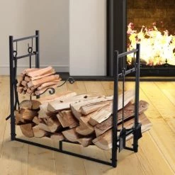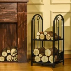 Outsunny Accessoires De Cheminée Serviteur De Cheminée Range Bûches 4 Accessoires Inclus Métal Noir